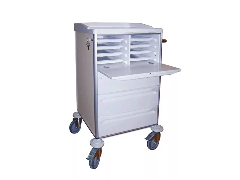 1 lenyíló ajtós, 3 fiókos kocsi , mely olyan osztályokon használható eredményesen ahol a gyógyszert előre