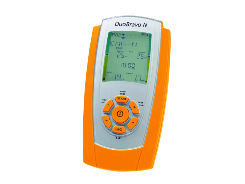 Programozhatóság és adatelemzésA készülék több programhelyet biztosít arra, hogy komplex, egyedi kezelőprogramot készítsen és tároljon. A programfázisokban a stimuláció, biofeedback és ETS fázisok tetszőlegesen kombinálhatók. Szakemberek számára külön rendelhető PC elemzőszoftver segít a páciens adott kezelése során rögzített EMG adatok kinyerése, tárolása és elemzése. Ez nagyban segíti az állapot változásának követését. A memória az utolsó 365 kezelési nap statisztikáit is mutatja. A PC szoftvert külön kell beszerzeni, nem része a készülék árának. A kezelés közben nem kell tartani a DuoBravo készüléket, mert a készülékhez egy kis tartó is jár, melyben sima felületen magától megáll. A páciens szabadon végezheti a gyakorlatot, közben pedig az erőkifejtés eredményeit figyelheti. Műszaki jellemzők- 2 csatornás eszköz EMG, EMG által kiváltott stimuláció (ETS) és Stimuláció üzemmódokkal